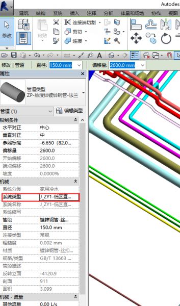 接著選中需要更改管道系統的管道,在屬性欄中選擇正確的系統類型,如圖所示。