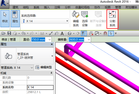 選擇需要改變管道系統的管道,點擊“管道系統”,再點擊“分割系統”,在彈出的對話框中選擇“確定”,如圖所示。