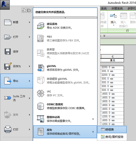 01、在Revit中生成明細表并切換到需要導出的明細表視圖(只能在明細表視圖中才能將該明細表導出為txt,在其它視圖中該導出選項不可用),點擊左上角菜單,依次選擇“導出-報告-明細表”命令,如圖所示。
