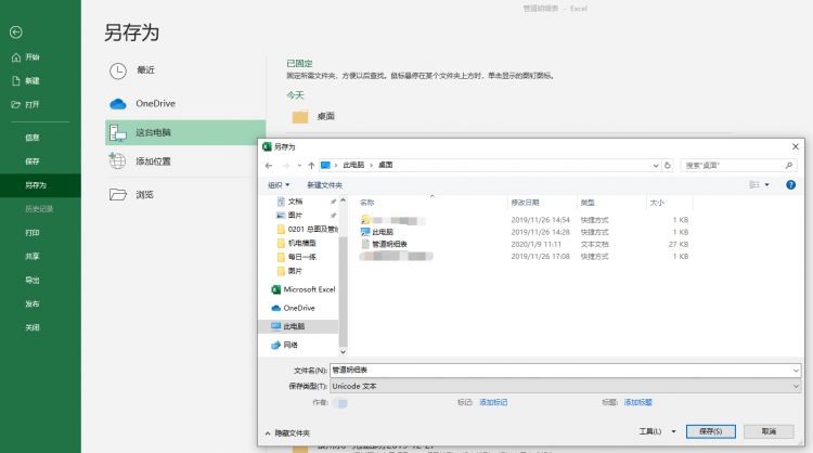 04、在Excel中依次點擊“文件-另存為”按鈕,選擇要保存的位置,如圖所示。默認的保存類型是Unicode文件,將其改成Excel工作簿,點擊保存即可。