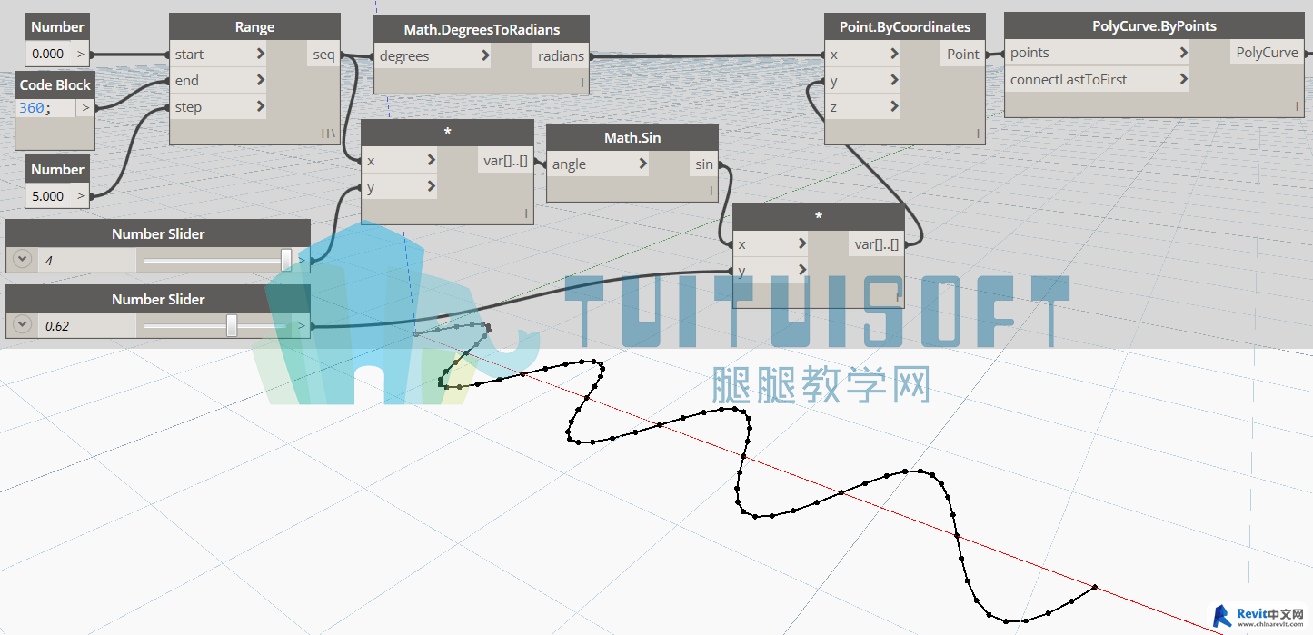 1、通過節點Point.ByCoordinates能夠生成指定坐標位置的點。其中,X分量為正弦函數的X值通過節點Math.DegreesToRadius將角度轉換為弧度單位。Y值等于正弦函數的結果乘以一個數值,該數值相當于振幅,圖中的數值為0.62。在節點Math.Sin輸入角度值之前,該角度值被乘以一個系數,該系數相當于頻率,圖中的數值為4。