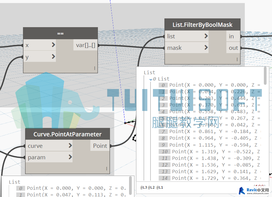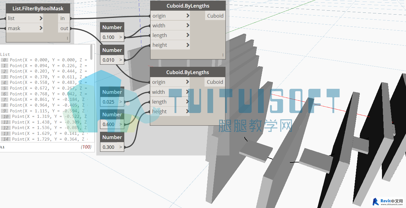 3.3 節點List.FilterByBoolMask可以根據true和false過濾從輸入端list輸入的數據。此時,true和false所組成的列表為有100個對象,并且true和false交替出現。所過濾的對象為步驟3.2中獲取的100個點。因此,輸出端in為所有與true對應的點,輸出端out為所有與false對應的點。
