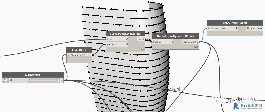 接下來,我們利用Curve.PointAtParameter獲取曲線的等分點(diǎn),并利用控制點(diǎn)重新生成樣條曲線,也可以放樣生成曲面(曲面在我們的后續(xù)操作中用不到,可以忽略)