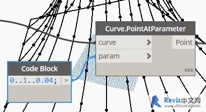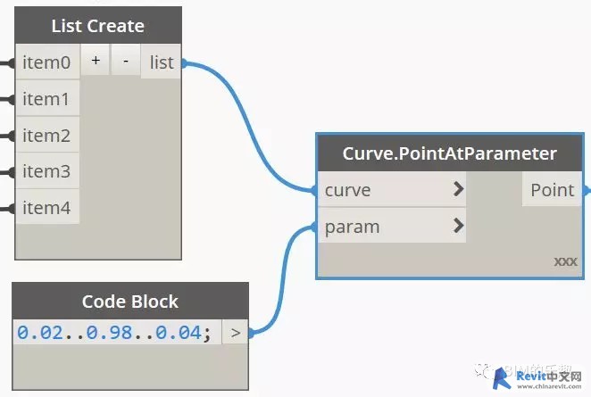 (1)接下來我們利用Curve.PointAtParameter節(jié)點(diǎn),將五邊形等分,為了能夠使五邊形的端點(diǎn)變圓滑,我們等分的時(shí)候,利用列表,跳過五個角點(diǎn)。