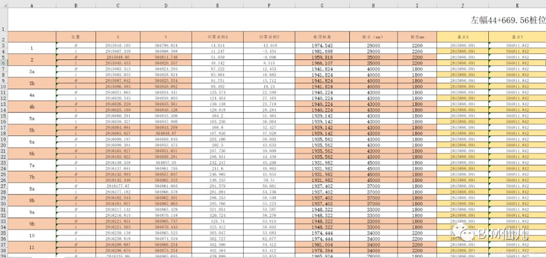 根據圖紙將樁基礎坐標信息、樁頂標高、樁長和樁徑數據記錄在excel表中: